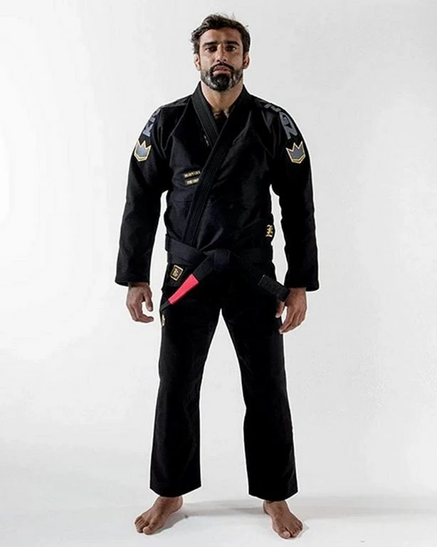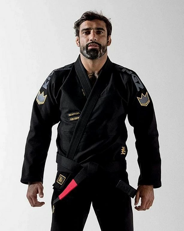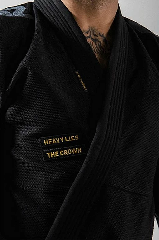 L’ultima versione di questo Gi si distingue per leggerezza e resistenza con un design classico con diversi loghi ricamati sia sulla giacca che sui pantaloni. Particolarmente degno di nota tra questi loghi è il motto “Heavy giace la corona” sul davanti della giacca, che è una metafora usata da Shakespeare nella sua commedia Enrico IV, parte 2, e indica che la persona che indossa la corona (il re) deve prendere decisioni difficili.
